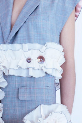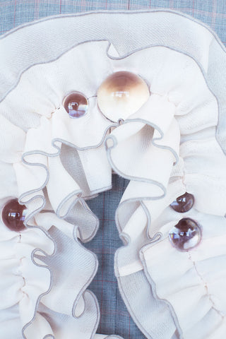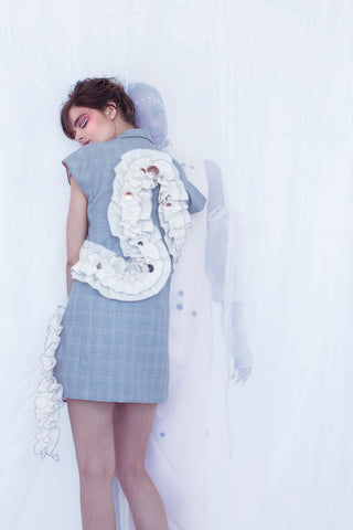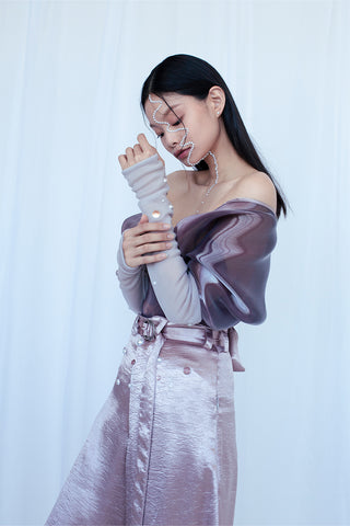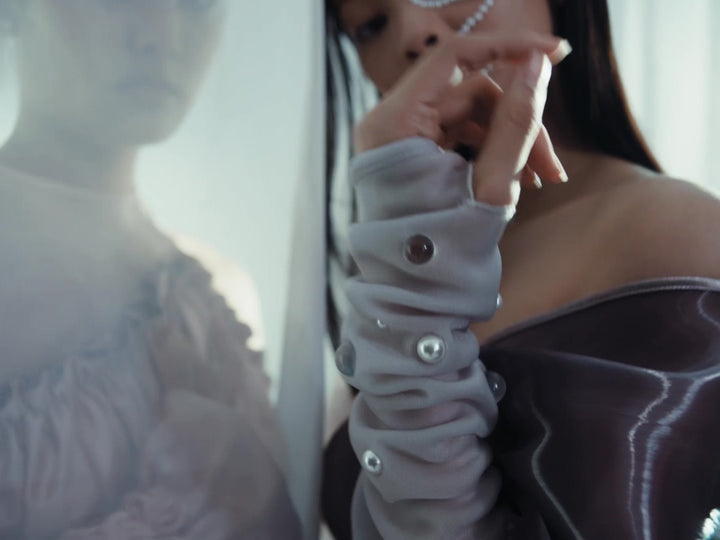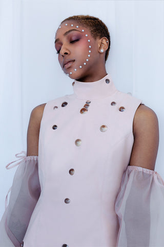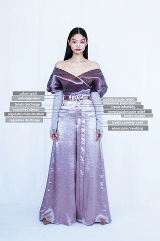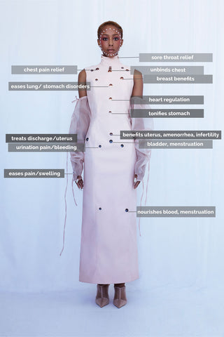Garments that functionally heal and empower: pearls and glass spheres are placed along acupressure points, offering a tactile form of care.