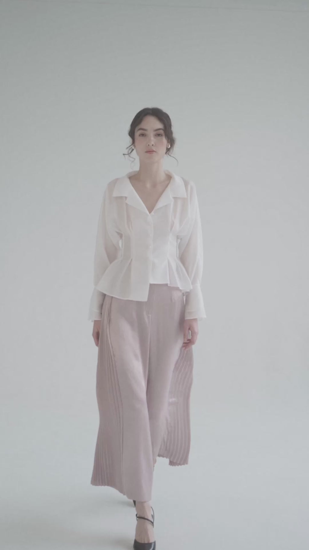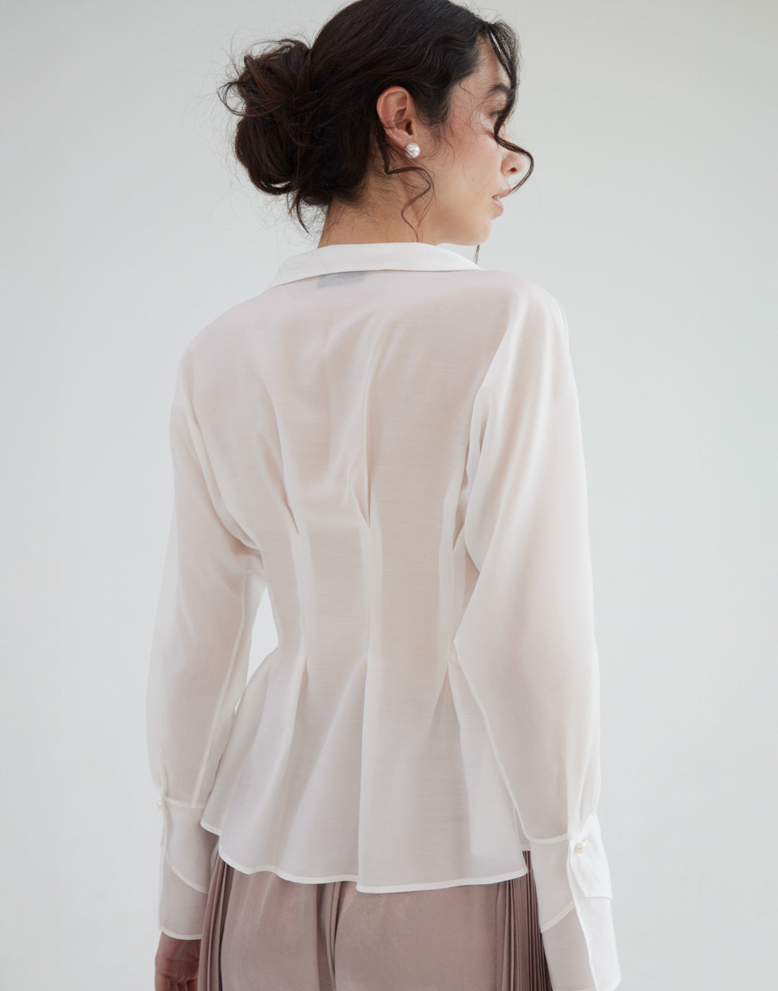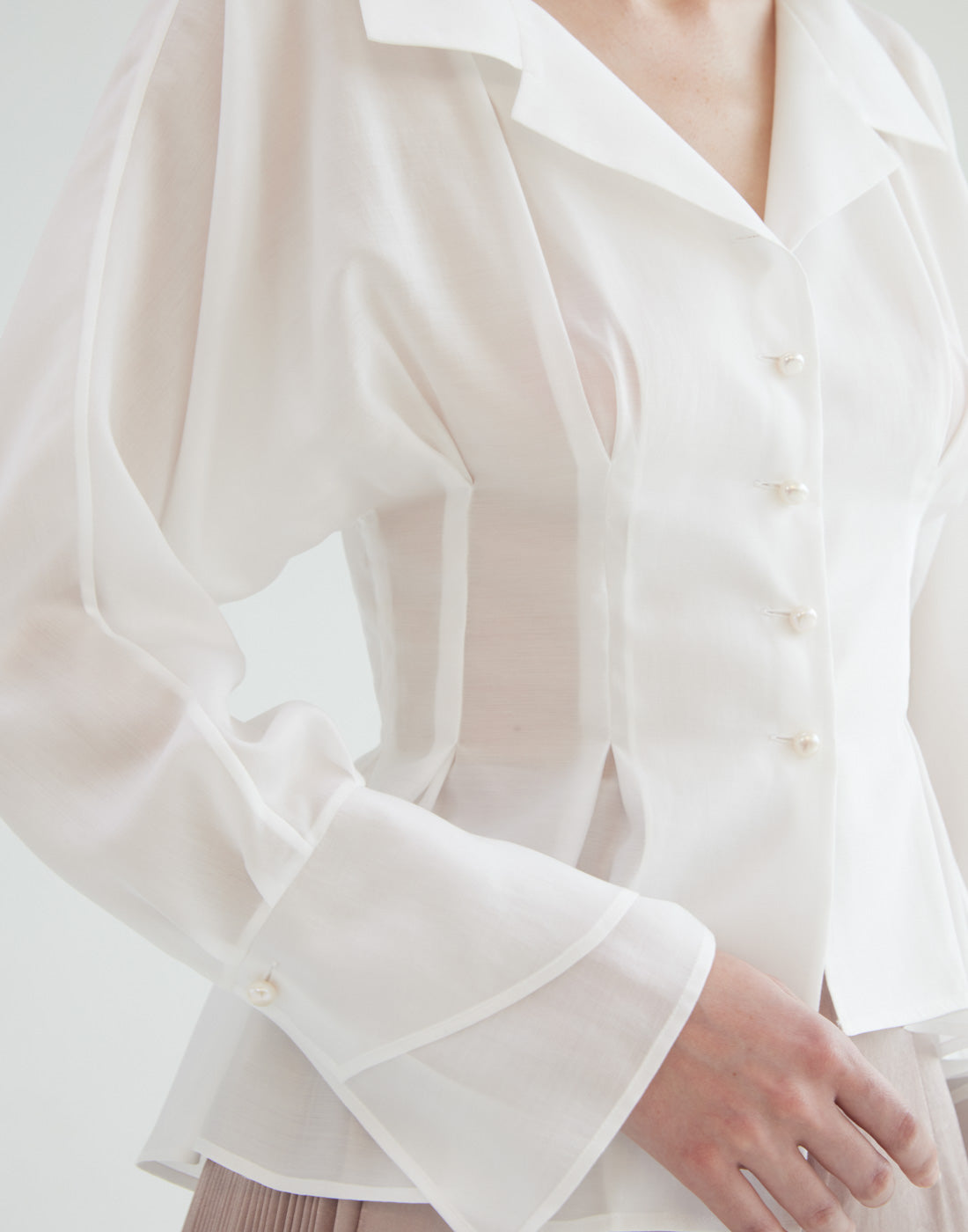 A contemporary twist on a timeless staple, the Dress Shirt features an asymmetrical hem and double layered cuffs that balance structured tailoring with avant-garde detail. The shirt is accentuated by genuine handcrafted pearl buttons that add a touch of femininity.