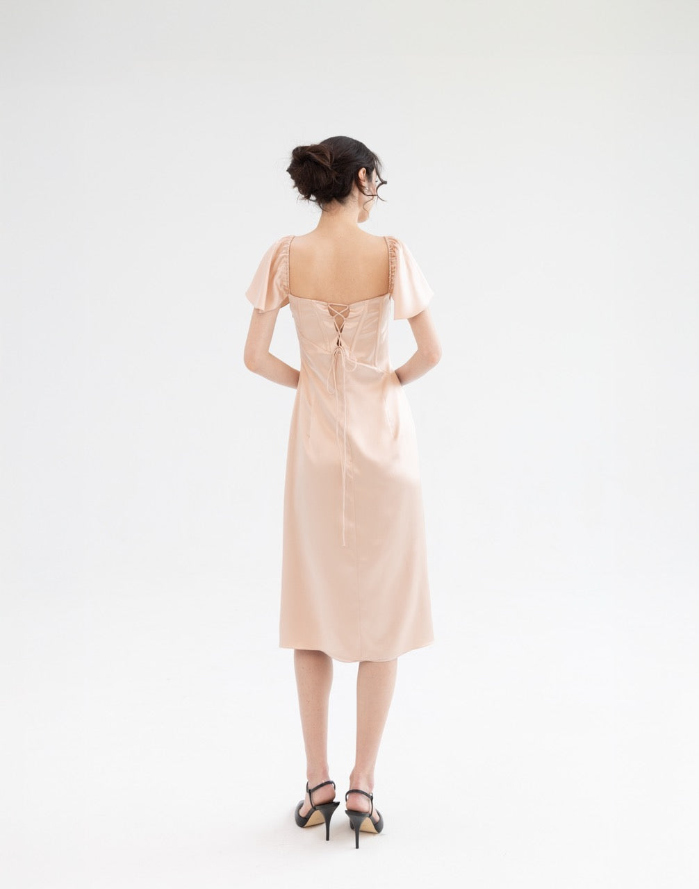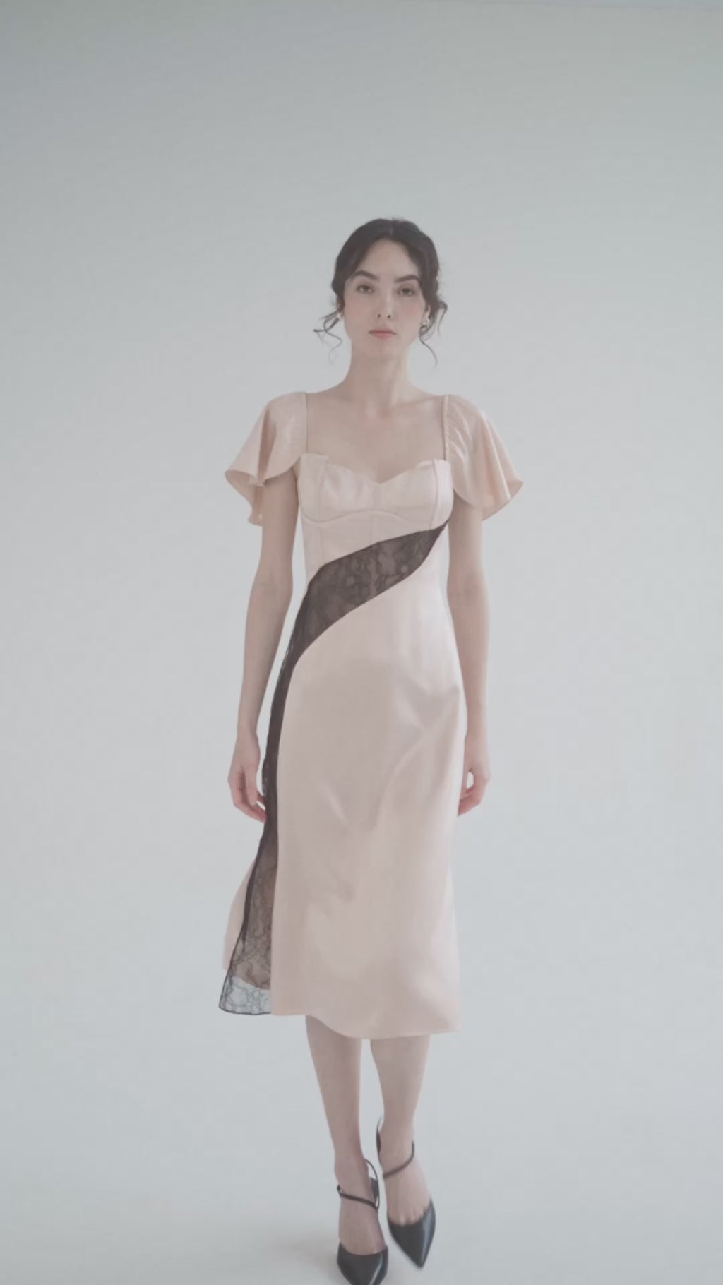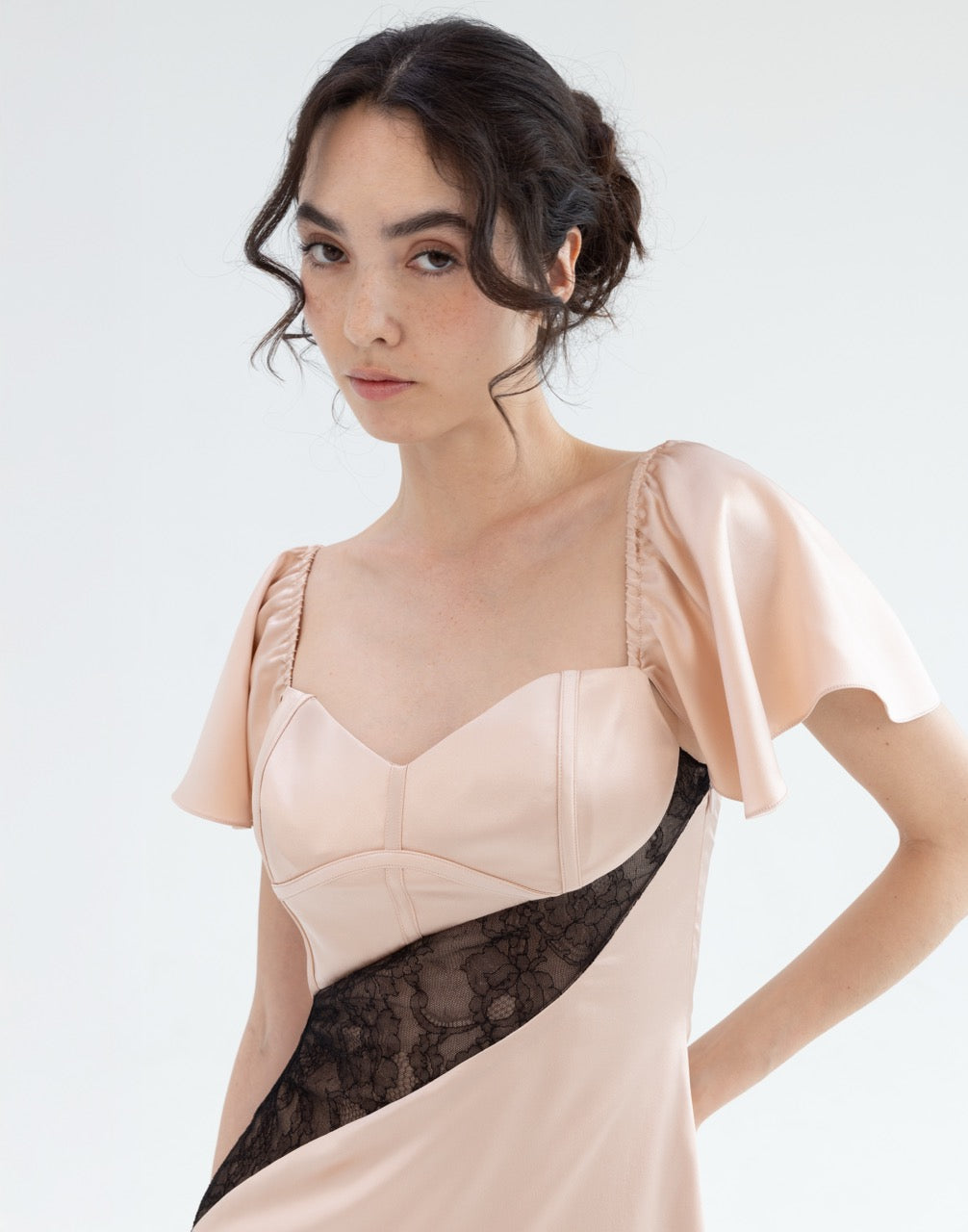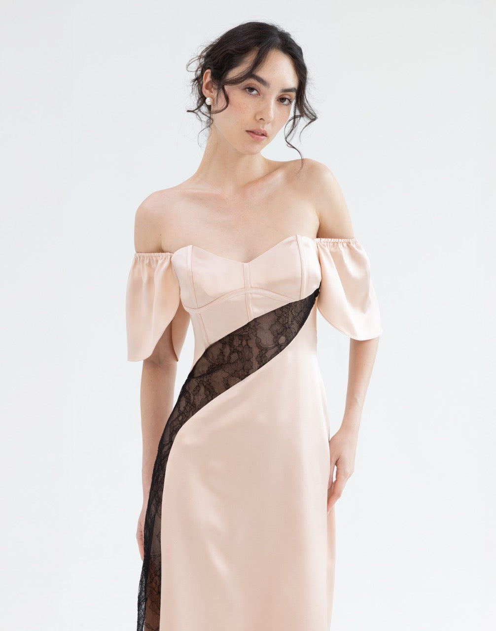 The Half Corset Dress is carefully and unconventionally interrupted by a curtain of French black lace cascading down the side of the dress, paying homage to the collection’s theme of depth revealed in absence.